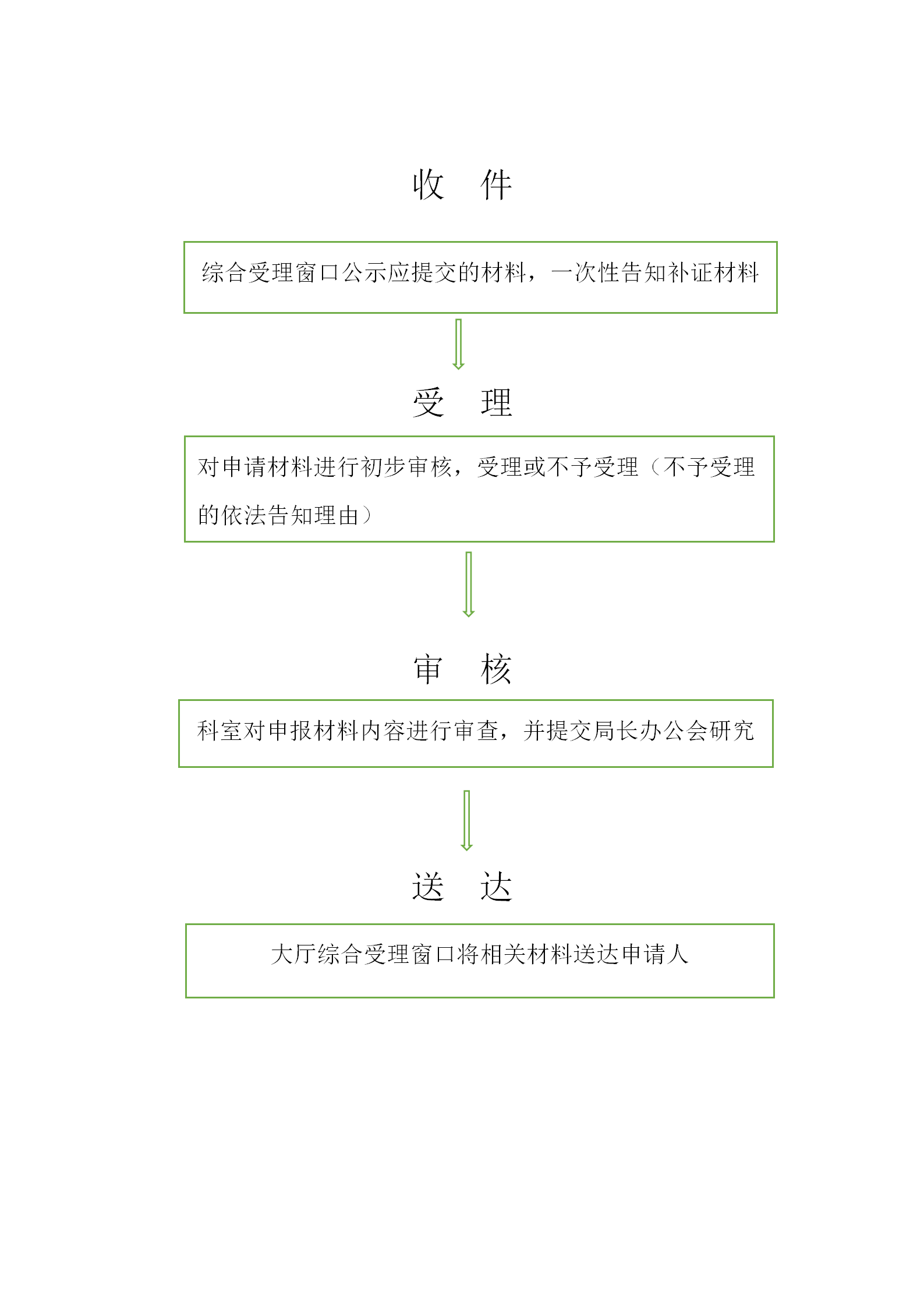 审核 科室对申报材料内容进行审查,并提交局长办公会研究。 送达 大厅综合受理窗口将相关材料送达申请人。 |