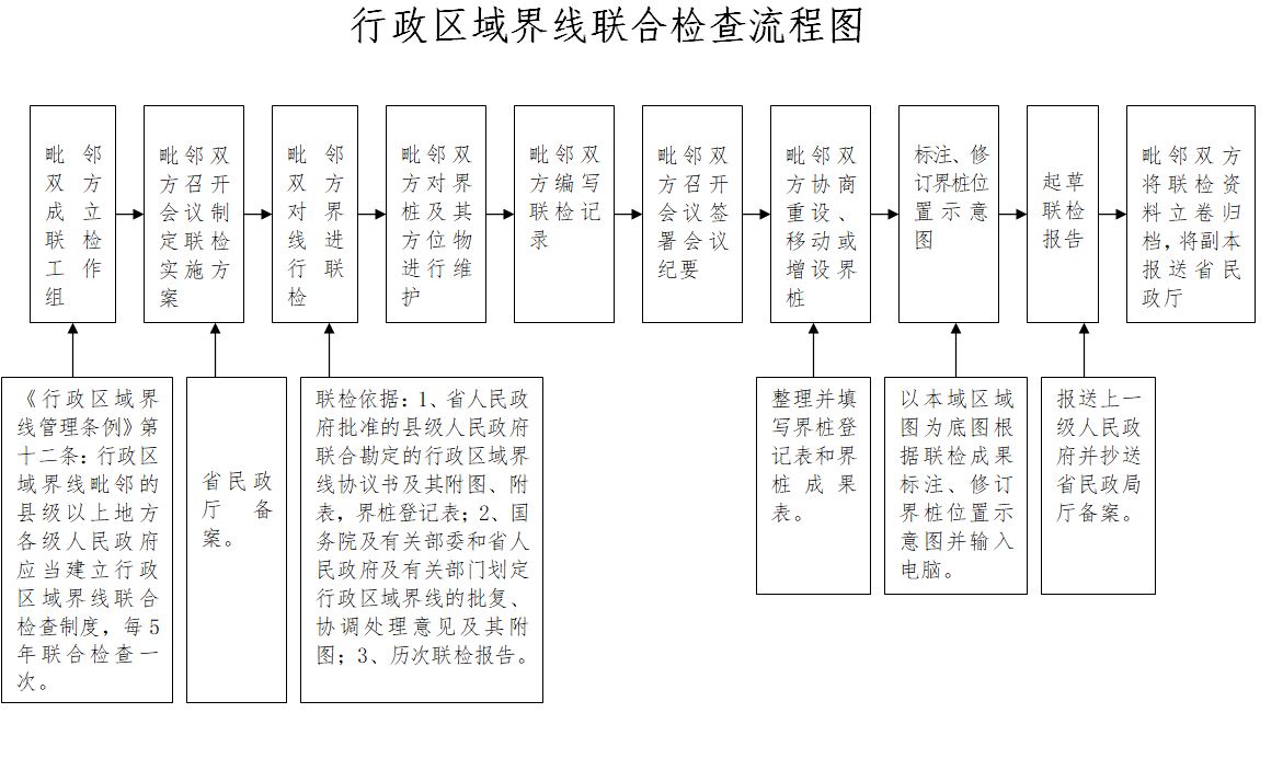 《行政区域界线管理条例》(中华人民共和国国务院令第353号)第十二条 行政区域界线毗邻的县级以上地方各级人民政府应当建立行政区域界线联合检查制度,每5年联合检查一次。遇有影响行政区域界线实地走向的自然灾害、河流改道、道路变化等特殊情况,由行政区域界线毗邻的各有关人民政府共同对行政区域界线的特定地段随时安排联合检查。联合检查的结果,由参加检查的各地方人民政府共同报送该行政区域界线的批准机关备案。 |